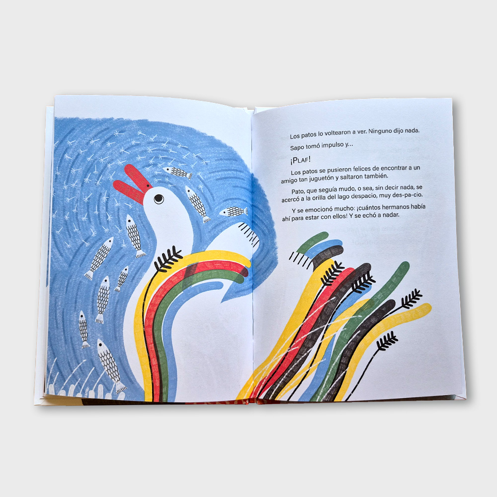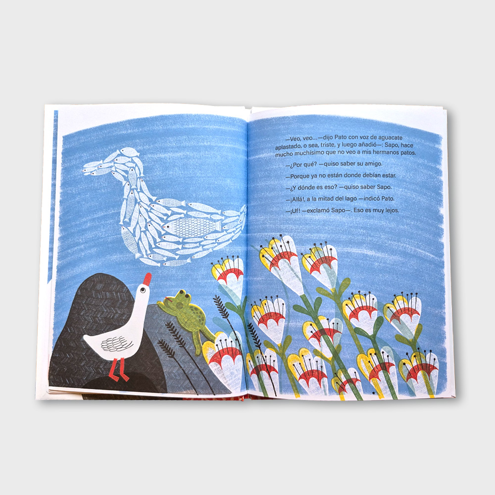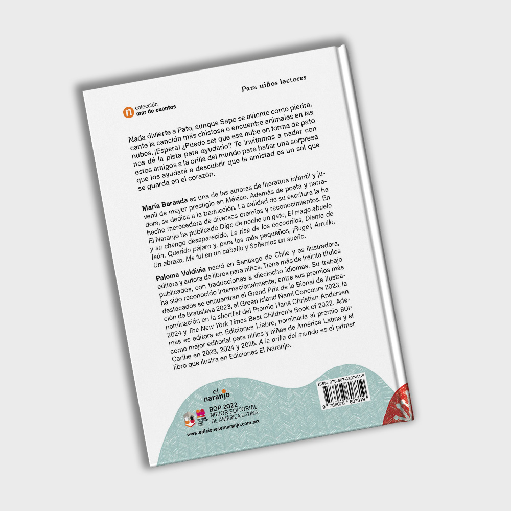 Nada divierte a Pato, aunque Sapo se aviente como piedra, cante la canción más chistosa o encuentre animales en las nubes. ¡Espera! ¿Puede ser que esa nube en forma de pato nos dé la pista para ayudarlo? Te invitamos a nadar con estos amigos a la orilla del mundo para hallar una sorpresa que los ayudará a descubrir que la amistad es un sol que se guarda en el corazón.